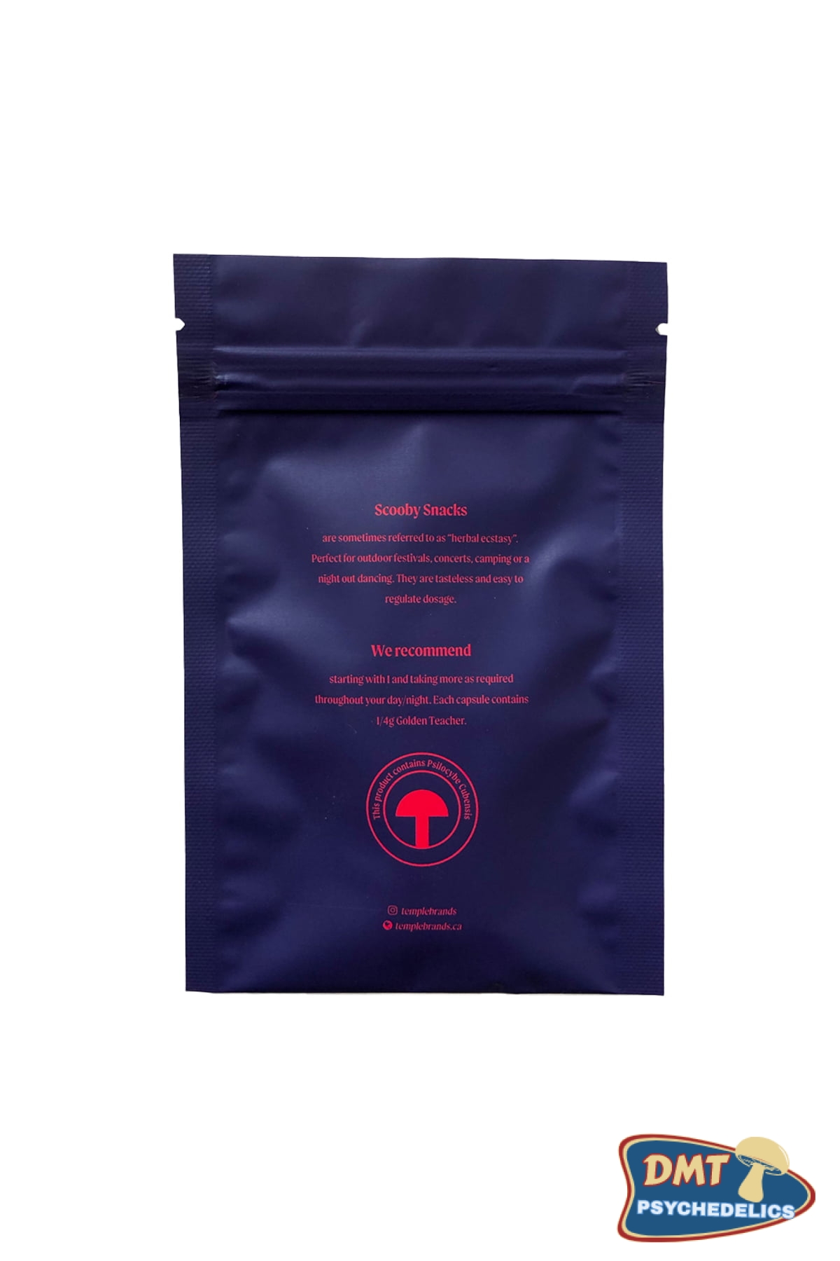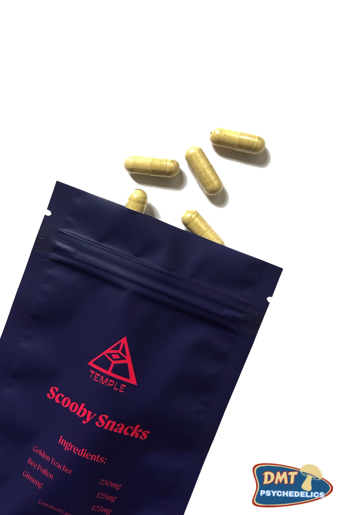 Temple Scooby Snacks, also called Scooby Snax, Scoobies, or Scoobs are fun little pills that contain 250 mg of psilocybe cubensis, 125 mg of Bee Pollen and 125 mg of Ginseng. This combination of herbs provides a balanced and energetic experience.